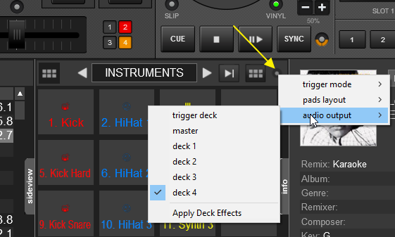 - Click on the Sampler Options button in the Sampler view of Sideview and select Deck 4 as Audio Output for Sampler.
