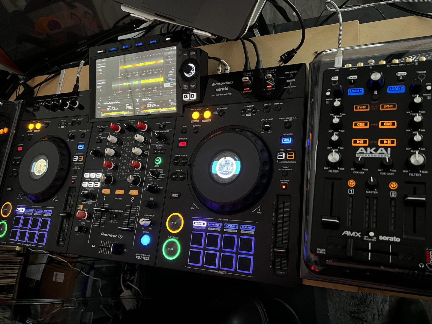 Lautstärke und EQ steuere ich über den Akai, alles andere über den RX3.
