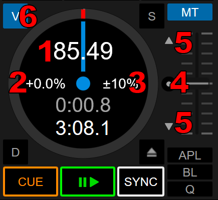 - Pitch Link Indicators: When your controller's pitch slider doesn't match the software pitch, these indicators will show you the direction on which you need to move the controller's pitch slider in order to link it with the software. This is similar to the function found on many (but not all) controllers. The pitch slider knob on the skin will turn RED when it's not linked to the controller, to further help you see the state of the pitch slider.