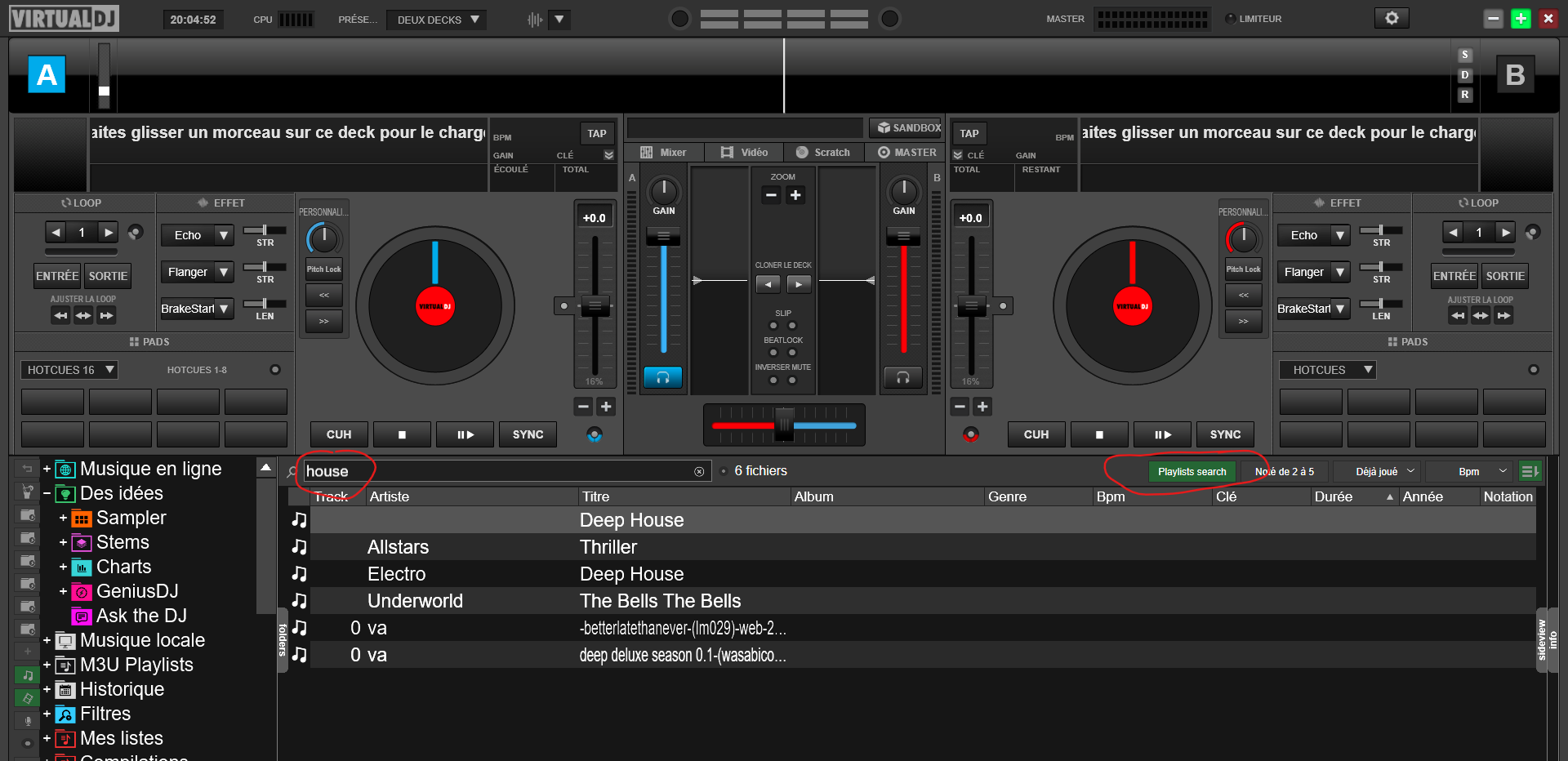With VirtualDJ's single search bar for playlists, you end up finding playlists mixed in with the tracks when you search for a song.