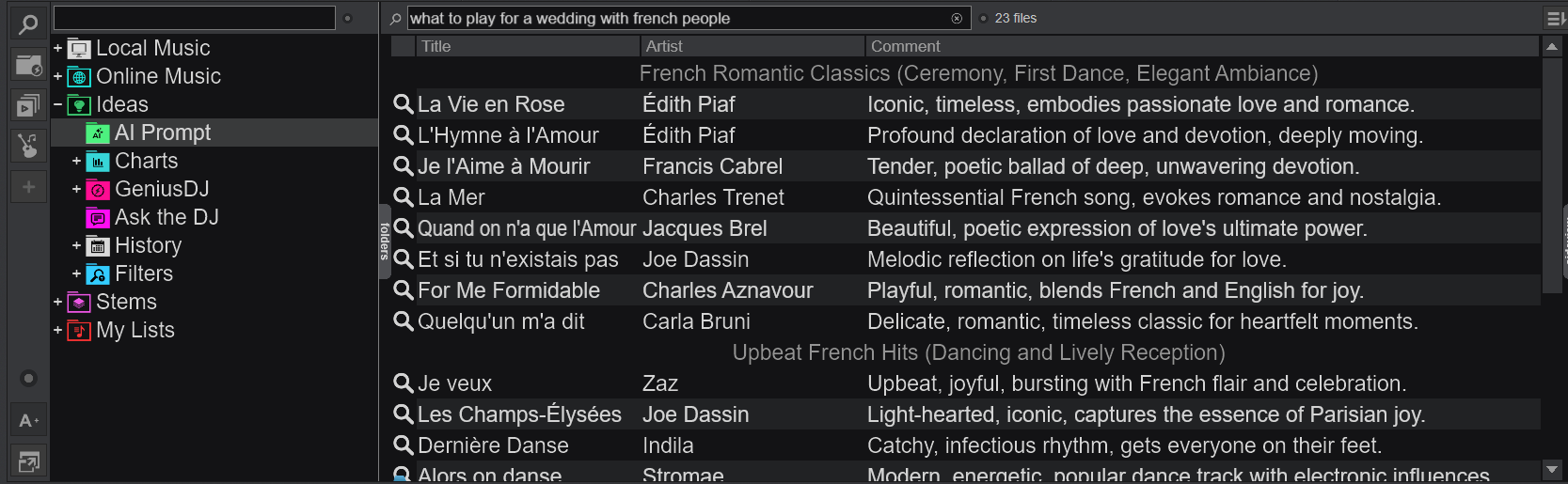 VirtualDJ 2026 leverages the power of LLM and integrates your very own AI Assistant directly inside VirtualDJ. Ask him any question, and the AI will give you a nicely formatted list of tracks recommendations, with his explanation for each track, all ready to be dragged directly to a deck and played.