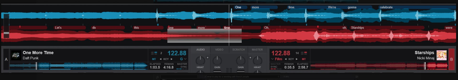 Dank massiven Fortschritten im Bereich der KI kann VirtualDJ nun automatisch die Songtexte aus jedem Track extrahiert und sie als Teil der Waveform darstellen.