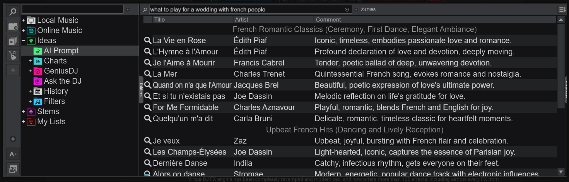 VirtualDJ 2026 nutzt die Leistungsfähigkeit von LLM und integriert Ihren eigenen KI-Assistenten direkt in VirtualDJ. Stellt ihm eine x-beliebige Frage, und die KI liefert Euch eine übersichtliche Liste mit Track-Empfehlungen inklusive Hintergrundinfo´s zu jedem Titel. Die Tracks können direkt per Drag & Drop in ein Deck gezogen und abgespielt werden.