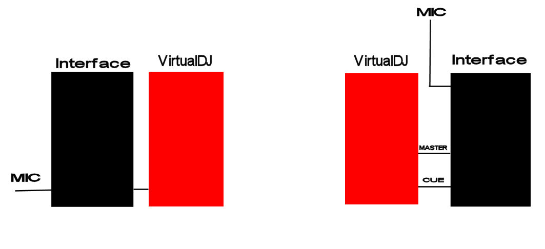 A typical DJ controller as used by many here would have an onboard audio interface and a direct mic input. It provides a config similar to the one on the right. That's what you need to aim for.
