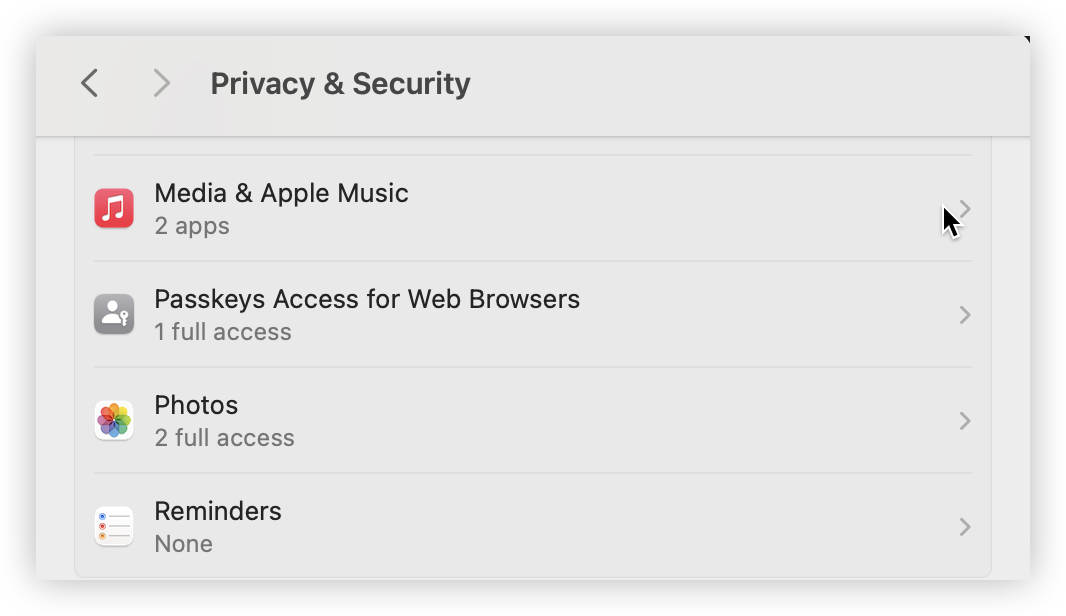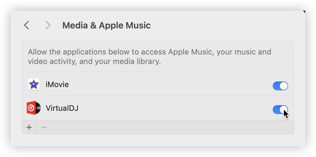 Use the icon to add VirtualDJ as an allowed application and use the toggle to turn on permissions.