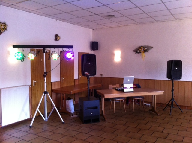 Holztisch klappbar, Frontplatz Eigenbau, Seitenteile klappbar, in den Profilen LED Stripes verbaut, PA inova 8 Power System ( 2 x 15" aktiv je 1000W, + 2 x line array Tops je 440Wrms) , ecler v90, Phase 26 USB, Asus Notebook als Musikrechner, Asus EeeTop Touchscreen als Lichtrechner mit daslight, im Saal verteilt 14 x PAR 56 LED (36x1W) inkl. Funksteuerung, + "kleine DJ Lichttechnik"