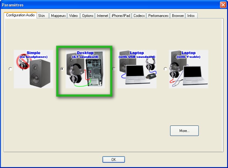 en bas à gauche de la fenêtre, configurer/quadriphone ou surround 5.1/tester