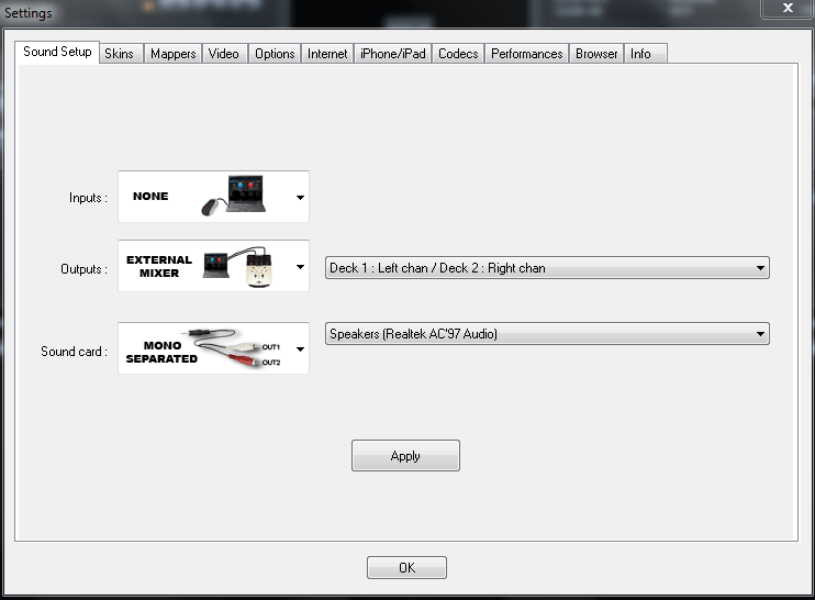 Hi, I did a gig last week and was attempting to use virtual DJ home edition just to try it out. I was only getting sound from one speaker and was hoping maybe some of you here could tell my what i might be doing wrong. I am running my laptop from the headphone jack into an external mixer and using powered speakers. I am able to get sound out of both speakers when using ITunes so I am pretty sure it is something I am doing wrong in the Config. Any help would be appreciated!
