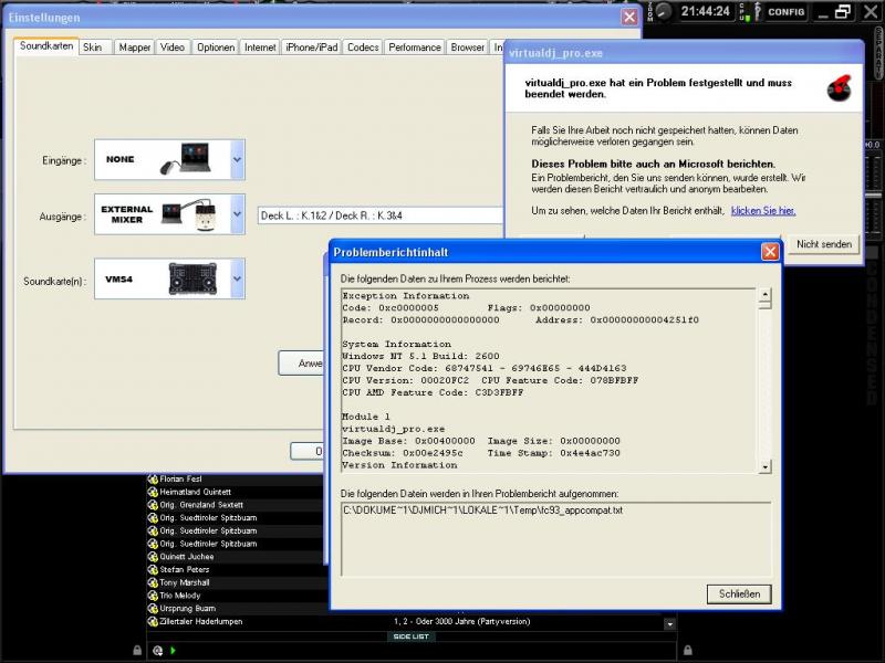 Steht in deinen Win-Soundeinstellungen NICHT die Console drinn? Wenn ich mal VDJ-Abstürze hatte, dann waren es immer andere Ursachen: