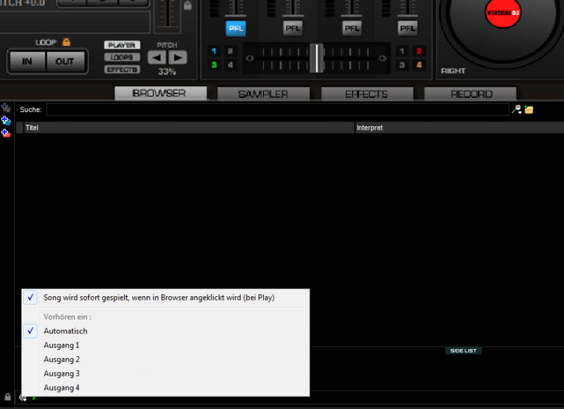 Genau so ist es in VDJ mit dem Vorhörplayer auch...musst Ihn nur richtig einstellen. Beispiel: Route das Vorhörsignal auf das Deck 4. "Play" Funktion aktiv. Sobald du einen Titel anklickst wird der Track über Deck 4 abgespielt. PFL Taste muss natürlich gedrückt sein.