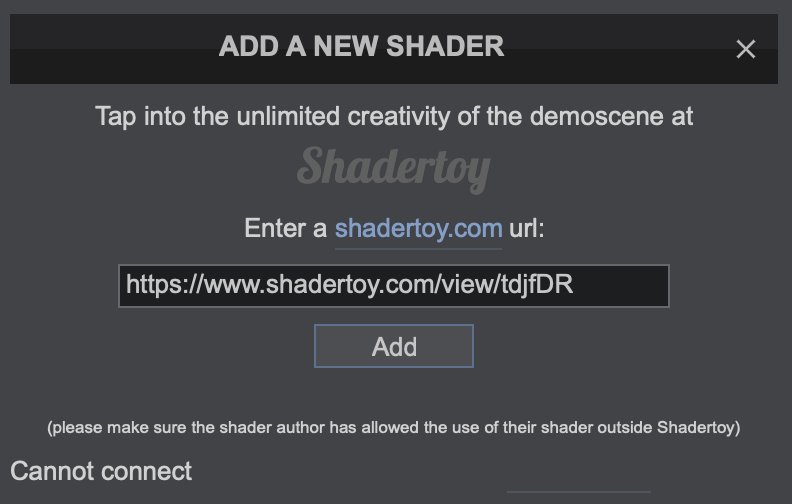 No puedo descargar shaders ultimamente, al momento de introducir la URL del shader me da el siguiente mensaje: CANNOT CONNECT