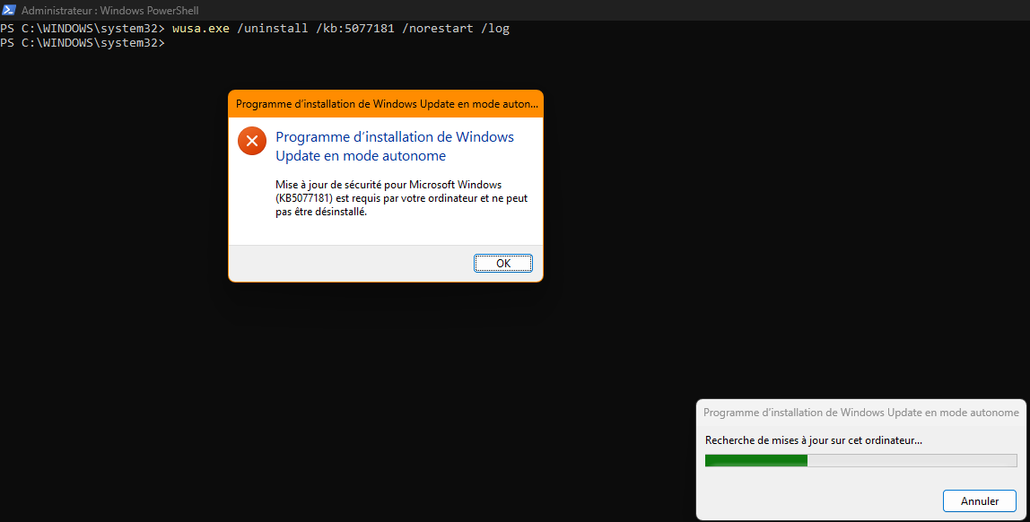 Il me reste une mise à jour a virer mais pas moyen, je suis passé par la console de récupération Windows puis désinstallé mise à jour, avec le powershell car impossible de désinstallé dans update de Windows, mais bloqué, ça me gave :