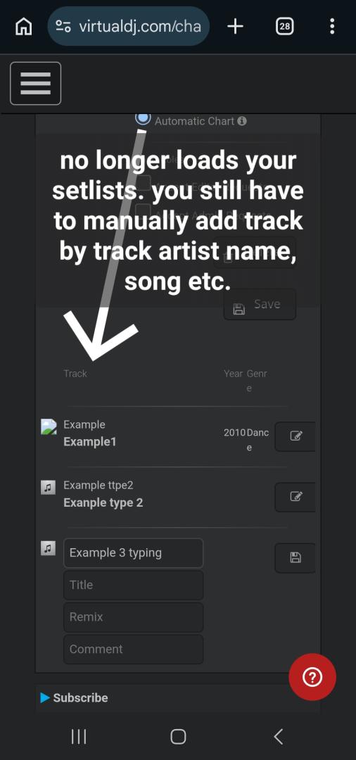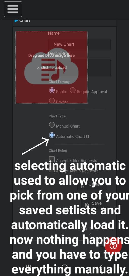 The community chart function has been broken for a while. It no longer lets you pick a setlist as a chart. Now you have to manually enter artist name and song instead of picking from your stored setlist. As most of us know, on average a 4 hour set has upwards of 100 songs, which makes it very difficult to type up 100 plus song artists, song names and specific remix. Pictures bwlow, as well as picture of a chart that had the songs automatically loaded from a setlist. Please fix this bug. Community charts is an excellent tool.