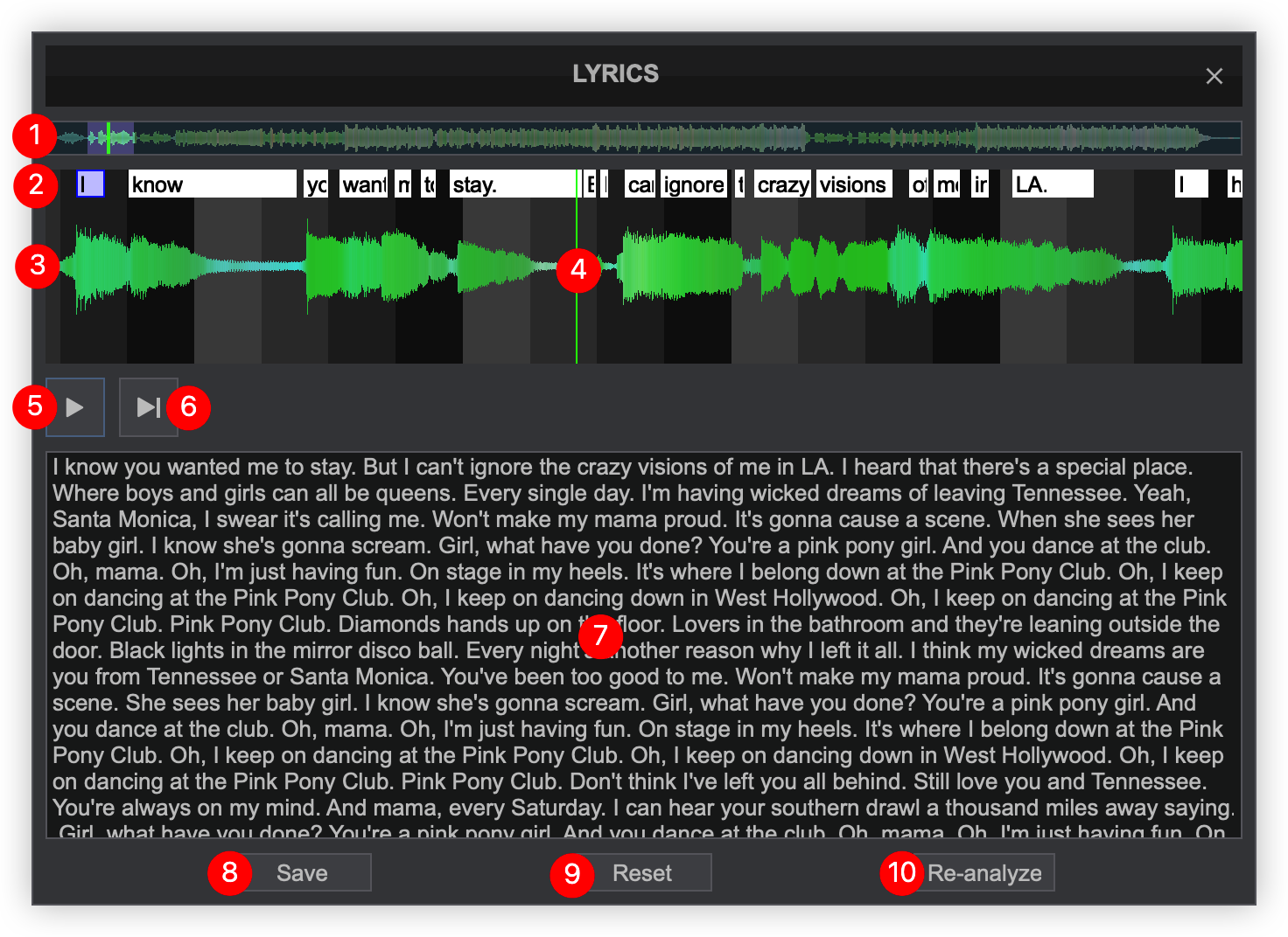 - WAVEFORM. Provides a visual display of the audio information and position of the lyrics as indicated by the playhead. It displays the beatgrid using the grayscaled background and can be zoomed in to make precise edits with a wheel mouse.