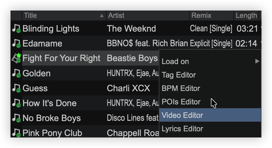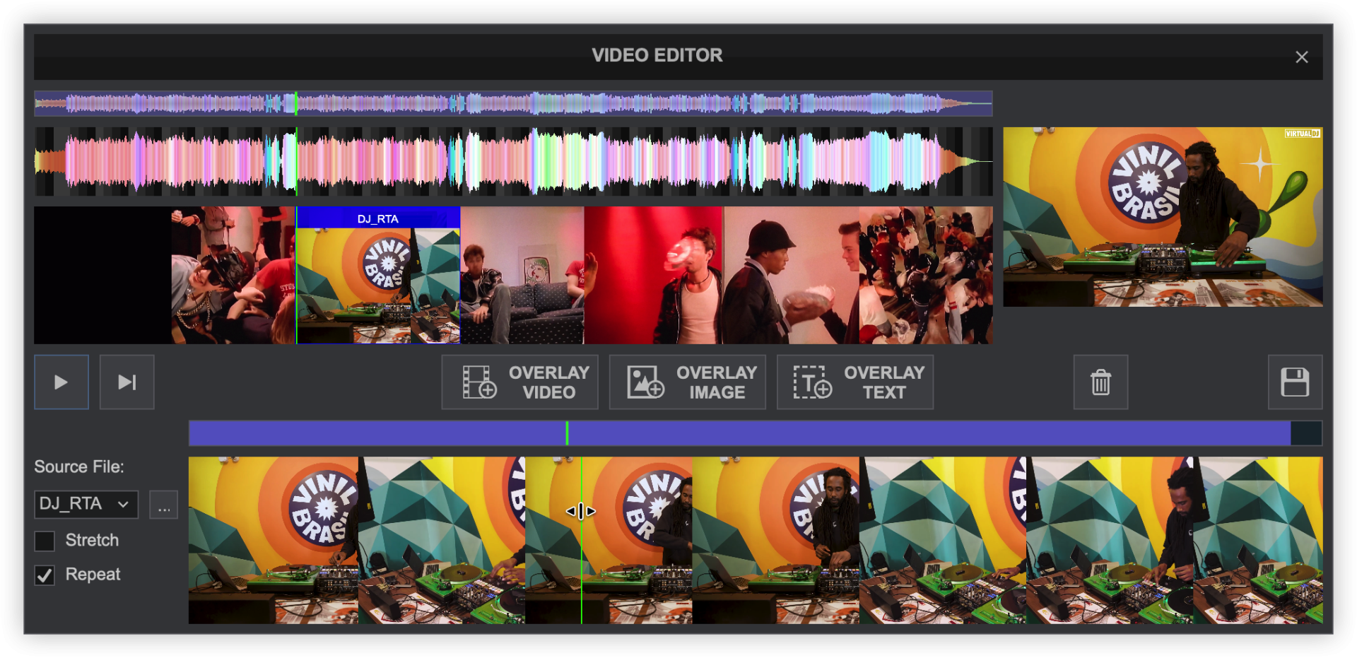 The Video Editor provides the ability to overlay video files and text over an existing Audio or Video track and is available as a Right-click option to any track in the File list. The process is non-destructive (does not alter the original file) and creates a special .vdjedit file that can be loaded to a deck and used in place of the un-edited original file.