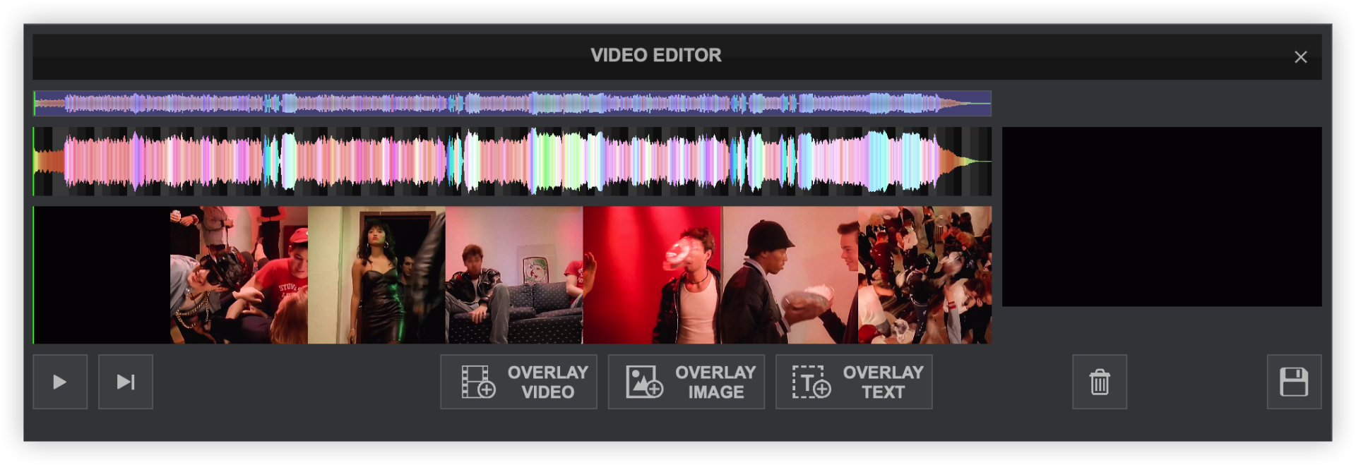 2. Once the Video Editor is opened, the multi-colored waveform will be displayed providing the tracks audio information. If the track is Audio only, the Video Timeline and Video Preview will be empty. If the track is a Video file, the Video Timeline will display the entire video and the Video Preview will be stopped on the first frame.